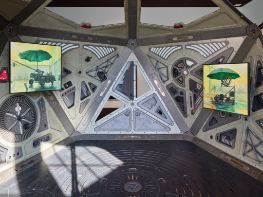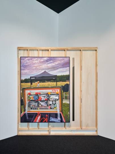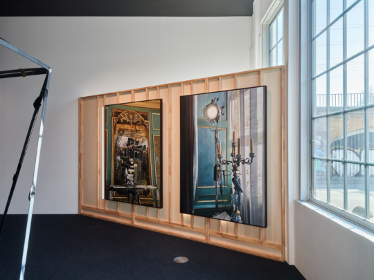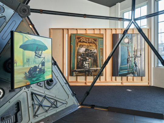 Basierend auf Fotografien und Zeichnungen, die Thie an Filmsets angefertigt hat, rücken die Gemälde von Geräten und Apparaturen, sie sich sonst hinter der Kamera befinden, ins Zentrum. Die Ausdehnung des Narrativs, das auch die Technik hinter den Kulissen miteinbezieht, spielte bereits in früheren Arbeiten Thies eine wichtige Rolle. Mit Studio treibt die Künstlerin dies auf die Spitze: Die ganze Welt ist eine Bühne, selbst die Kulisse wird zur Protagonistin. Im Raum treffen Malereien und Filmset aufeinander: Sie reinszenieren die Dramen vor und hinter der Kamera, während ihre entrückte Platzierung das ursprüngliche Narrativ der Kulisse bewusst stört. Sie erzählen nicht nur von der Technik selbst, sondern auch von der unsichtbaren Arbeit und den Schatten der Produktion hinter der Fiktion, die sonst erst mit dem Abspann sichtbar werden.
