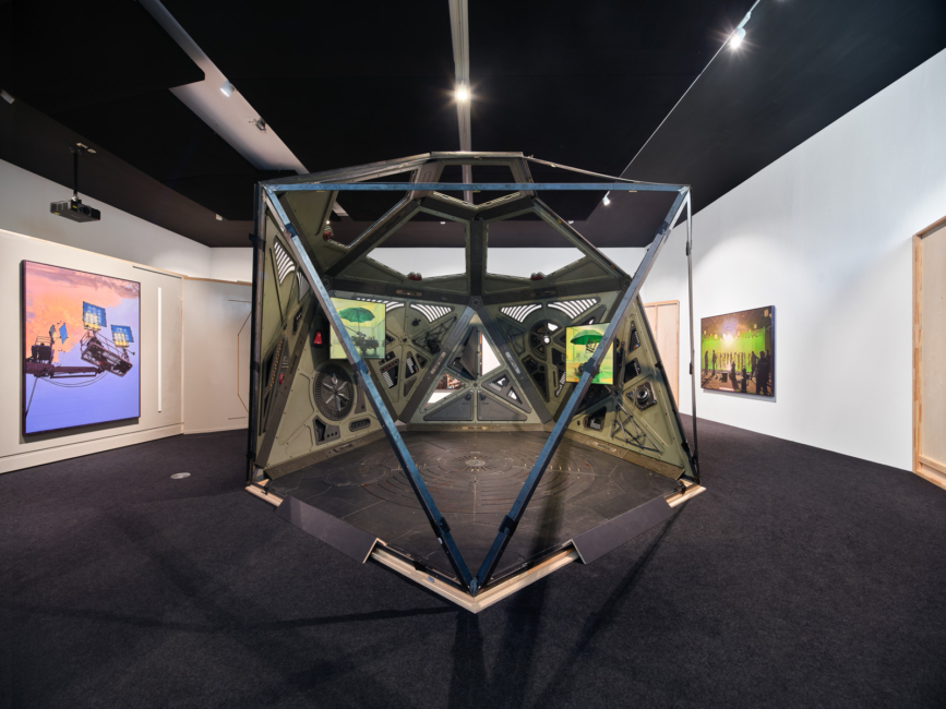 Für Studio bedient sich Britta Thie der Bildwelten der Filmindustrie und überführt diese in den Ausstellungsraum. Eine echte Filmkulisse wird zum Ausstellungssetting und das technische Equipment in den Malereien – Kamerawagen, Scheinwerfer und andere Apparaturen – zu Hauptfiguren. Deren hyperrealistische Darstellung eröffnet eine theatrale Dimension, die vom Leben vor, während und nach Ablauf der Dreharbeiten zu erzählen scheint. Britta Thie verweist mit Studio auf sogenannte »Prop-Graveyards« – »Requisiten-Friedhöfe«, in denen gesamte Filmkullissen und deren Erzählungen losgelöst von Zeit und Raum darauf warten, für eine weitere Staffel wiederbelebt zu werden.